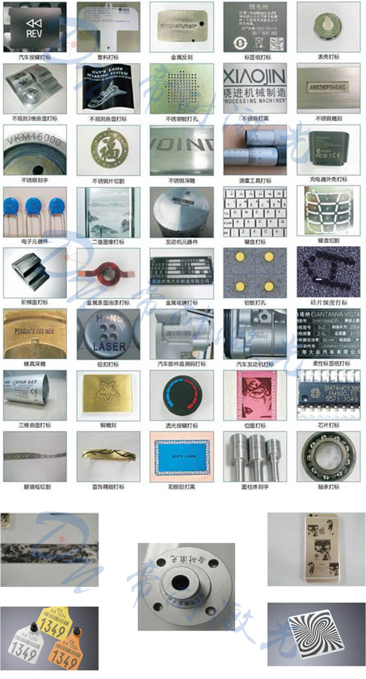 廣泛適用于集成電路芯片、電腦配件、工業(yè)軸承、鐘表、電子及通訊產(chǎn)品、航天航空器件、各種汽車零部件、家電、五金工具、模具、電線電纜、食品包裝、首飾、煙草以及軍工產(chǎn)品等眾多領(lǐng)域圖形和文字的標(biāo)記,以及大批量生產(chǎn)線作業(yè)。
